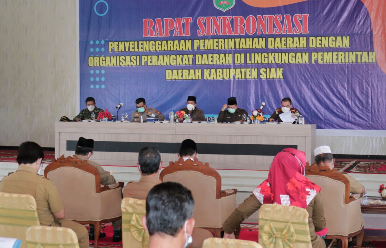 SIAK- Bupati Siak Alfedri memimpin Rapat Sinkronisasi Penyelenggaraan Pemerintah Daerah, dengan Organisasi Perangkat Daerah di Lingkungan Pemerintah Kabupaten Siak yang diselenggarakan di Balairung Datuk Empat Suku Komplek Abdi Praja Perumahan Bupati Siak, Selasa (13/7/21).