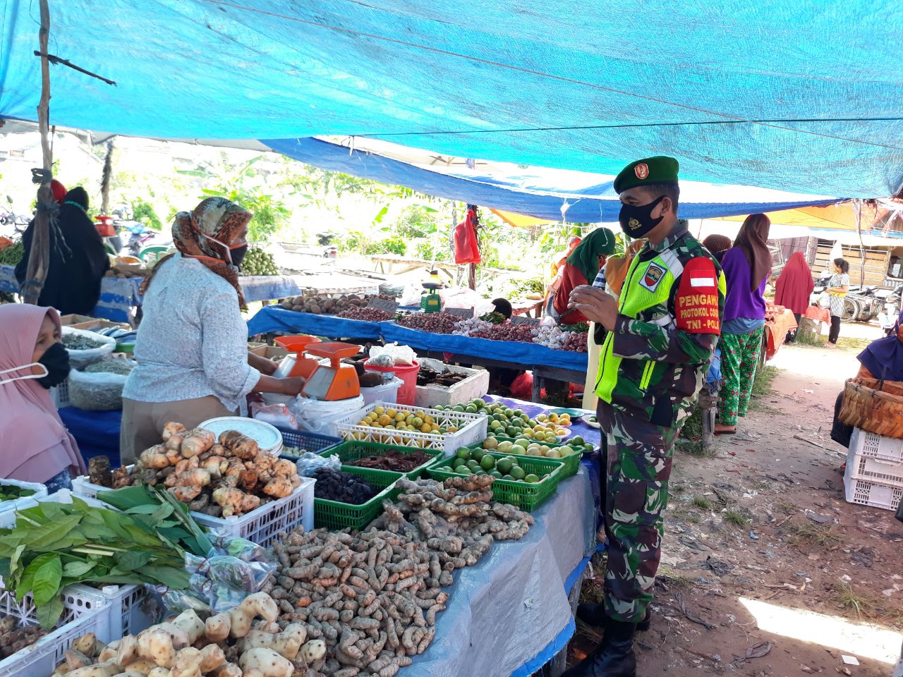 Dalam kesempatan tersebut Babinsa memberikan himbauan kepada penjual dan pembeli untuk tetap patuhi Protokol Kesehatan serta sampaikan tentang hidup sehat.