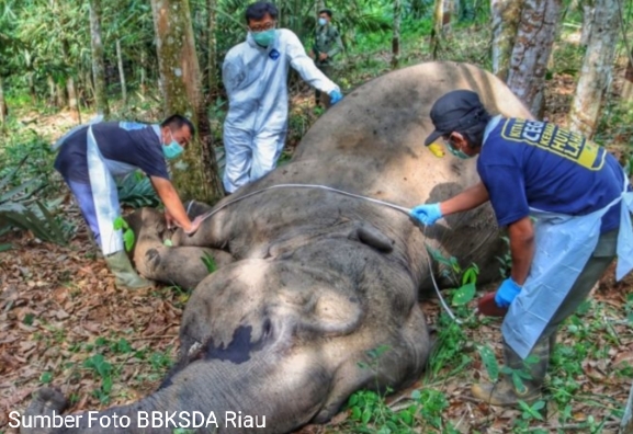 “Hari itu juga kita langsung menurunkan tim Balai Besar KSDA Riau dengan didampingi oleh tim RAPP melakukan olah TKP dan nekropsi terhadap bangkai gajah. Dari hasil nekropsi dan pemeriksaan secara patologi yang dilakukan oleh tim medis Balai Besar KSDA Riau. Diduga penyebab kematian gajah betina yang berusia sekitar 45 (empat puluh lima) tahun tersebut adalah gangguan pada organ hati (hepar) dan sistem pernapasan,” bebernya.
