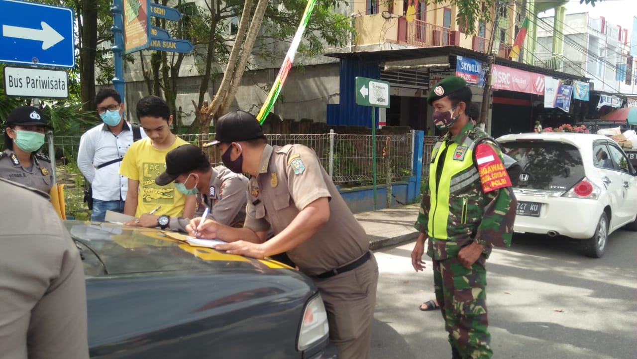 “Tim gabungan TNI, POLRI dan Satpol PP Kecamatan Siak menyisir jalur kota atau tempat -tempat yang dianggap ramai, Bilamana masih di temui masyarakat yang tidak mematuhi protokol kesehatan tidak memakai masker di beri sangsi sesuai Perbup Kabupaten Siak.” Ujarnya.