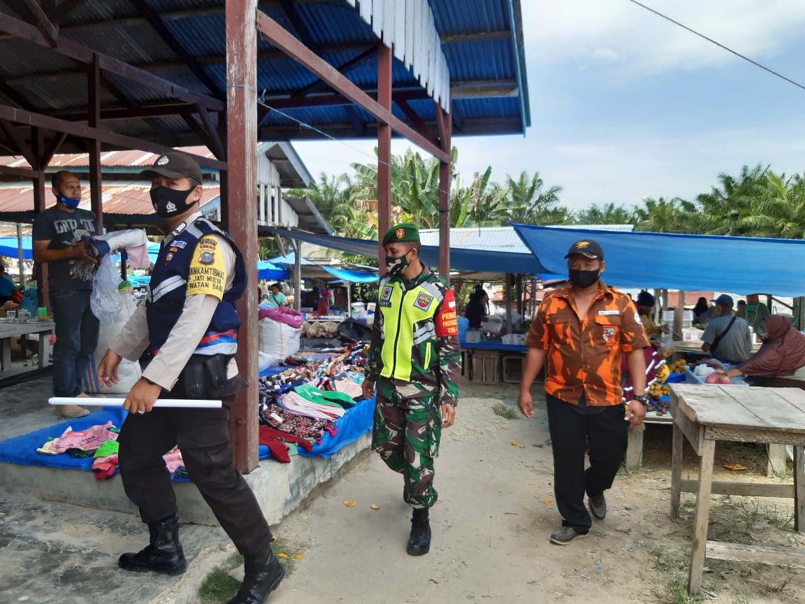 Kerinci Kanan – Berbagai upaya untuk menekan penyebaran Virus Covid-19 terus dilakukan di wilayah binaan Kampung Jati Mulia Kecamatan Kerinci Kanan oleh Babinsa Koramil 03/Siak bersama Bhabinkamtibmas Polsek Kerinci Kanan dan PP Kecamatan melaksanakan patroli keliling pasar terhadap warga yang melaksanakan aktifitas jual beli yang tidak menerapkan protokol Kesehatan khususnya penggunaan Masker dan jaga jarak, Jum’at (05/03/2021)