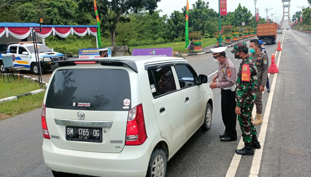 Siak Sri Indrapura – Aparat Gabungan dari Koramil 03/Siak bersama Polsek Siak, Satpol PP dan Dinas Perhubungan Kabupaten Siak melaksanakan kegiatan penyekatan di jembatan Tengku Agung Sultanah Latifah(TASL) Kelurahan Sei. Mempura Kecamatan Mempura Kabupaten Siak, Kamis (19/08/2021).
