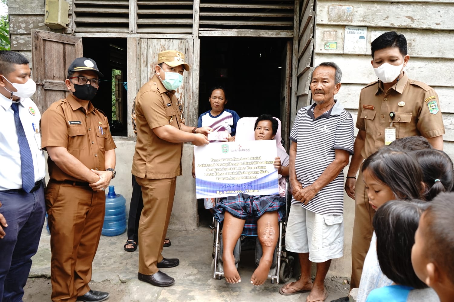 SIAK- Wakil Bupati Siak Husni Merza menyerahkan bantuan program sosial asistensi orang dengan disabilitas berat kepada Maylisa (24) Warga kecamatan Dayun.
