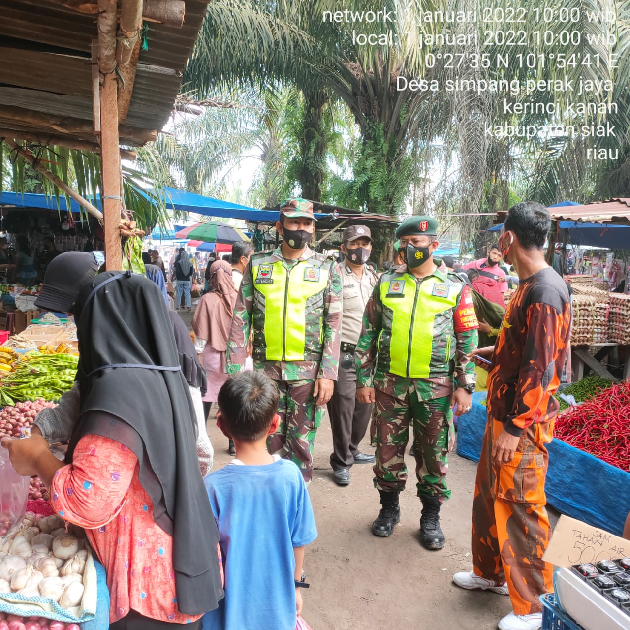 SIAK- Guna memutus mata rantai penyebaran Virus Covid 19 di wilayah Kecamatan Kerinci Kanan, Personel Bintara Pembina Desa (Babinsa) Koramil 01/Siak, Kodim 0322/Siak Serda A. Siburian bersama Bhabinkamtibmas,Ormas Pemuda Pancasila dan perangkat Kampung turun ke wilayah binaanya untuk melaksanakan kegiatan pengawasan protokol covid-19 kepada masyarakat agar tetap menggunakan masker setiap keluar rumah, cuci tangan pakai sabun, menjaga jarak. Kegiatan tersebut yang dilaksanakan bertempat di Pasar