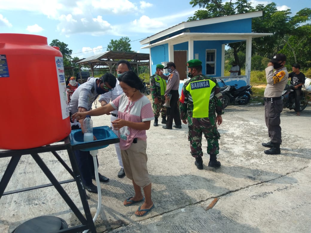 Tiga Pilar di Kampung Kerinci Kanan Laksanakan Penegakan Disiplin Protokol Kesehatan di Pintu Masuk Pasar Tradisional.