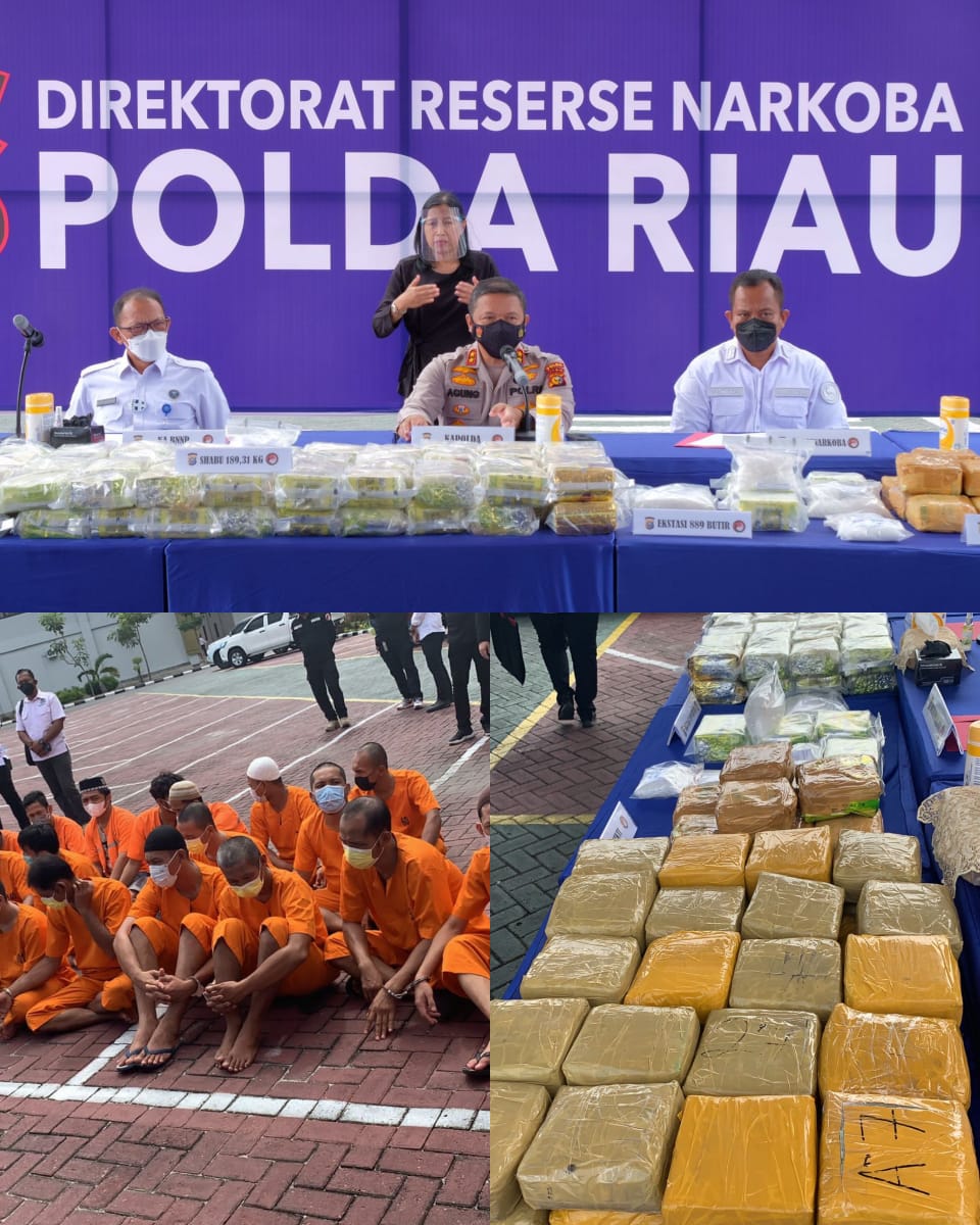 Kapolda Riau Irjen Agung Setia saat menggelar konferensi pers bersama Kepala BNNP Riau Brigjen Robinson Siregar, Dir Resnarkoba Kombes Victor Siahaan, Kabid Humas Kombes Narto, Kabid Labfor AKBP Yani Nursyamsu serta perwakilan dari Kejaksaan Tinggi Riau dan Kejaksaan Negeri Bengkalis menegaskan tidak ada ruang bagi peredaran narkoba di provinsi Riau.