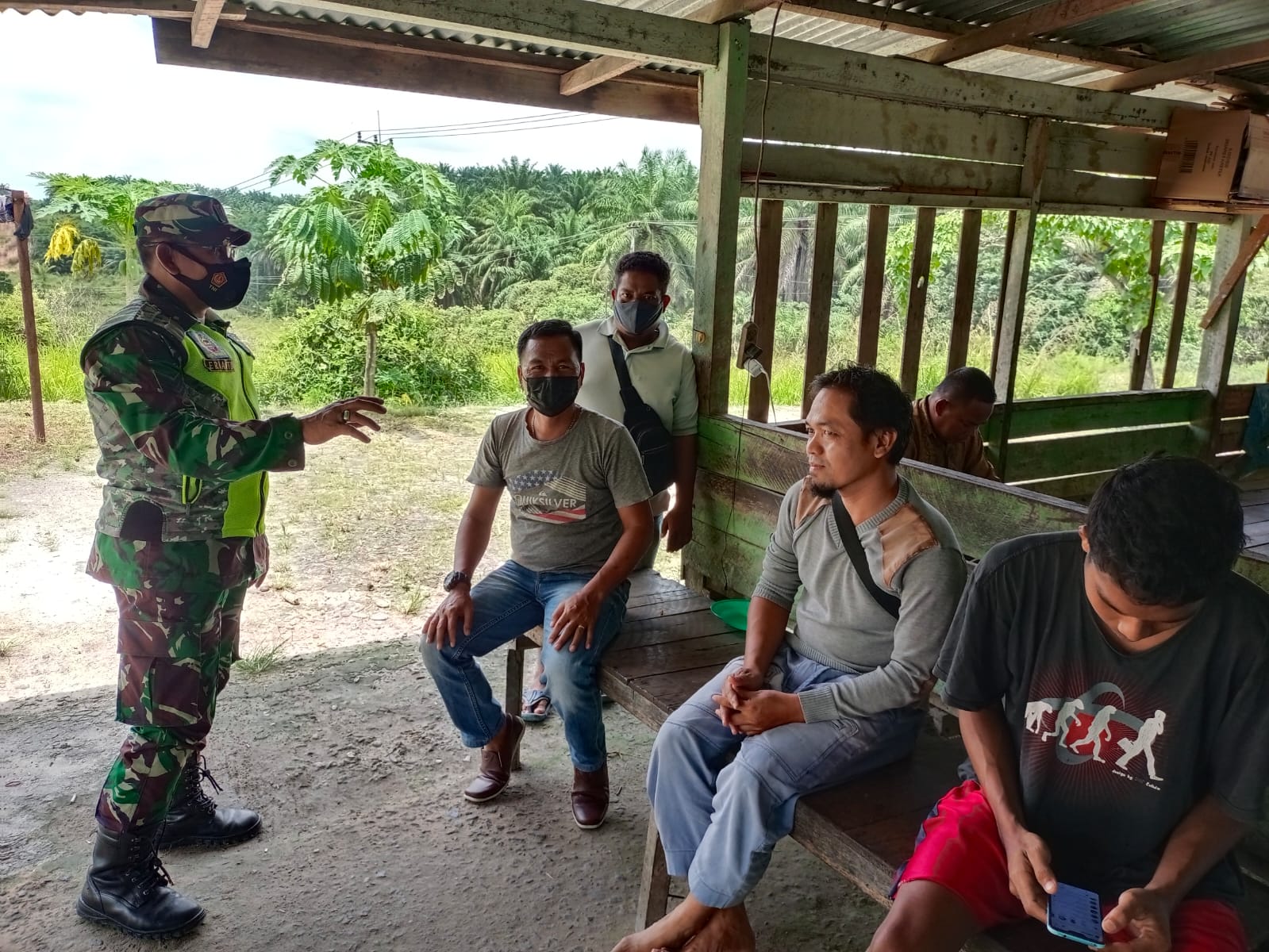 dengan melakukan komunikasi sosial (Komsos) dan silaturahmi dengan warga desa binaannya, Serma Erianto sampaikan himbauan terkait penerapan protokol kesehatan kepada warga masyarakat Kampung binannya.