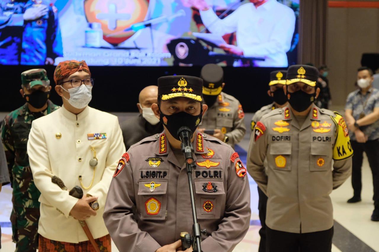JAKARTA – Panglima TNI Marsekal Hadi Tjahjanto dan Kapolri Jenderal Listyo Sigit Prabowo meninjau langsung kegiatan serbuan vaksinasi massal Covid-19 di Bandung, Jawa Barat, Kamis (10/6/2021). Setidaknya, kegiatan itu bakal diikuti oleh 7.010 masyarakat se-Bandung Raya.