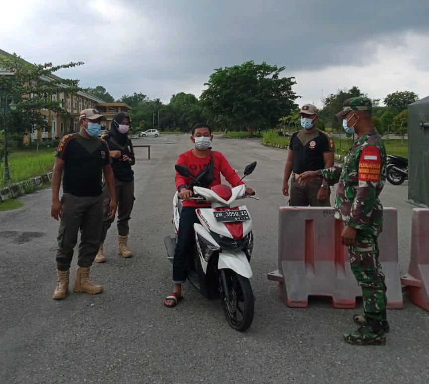 Siak – Anggota TNI dan Satpol PP menjaga dengan ketat tempat isolasi pasien Covid 19 di Asrama Haji Kel. Kampung Tempat Kec. Siak Kabupaten Siak, Sabtu (05/06/2021).