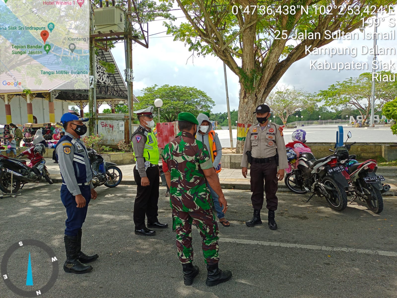 “Dimana patroli gabungan penegakan protokol kesehatan, dengan sasaran di taman Mahratu, Taman Sri Bijuang, Taman Jambatan Tengku Agung Sultan Latifah(TASL) dan Istana Siak Kecamatan Siak dalam hal ini masih kita jumpai beberapa warga yang lalai tidak mematuhi protokol kesehatan berupa tidak pakai masker,” kata Serka Joni.