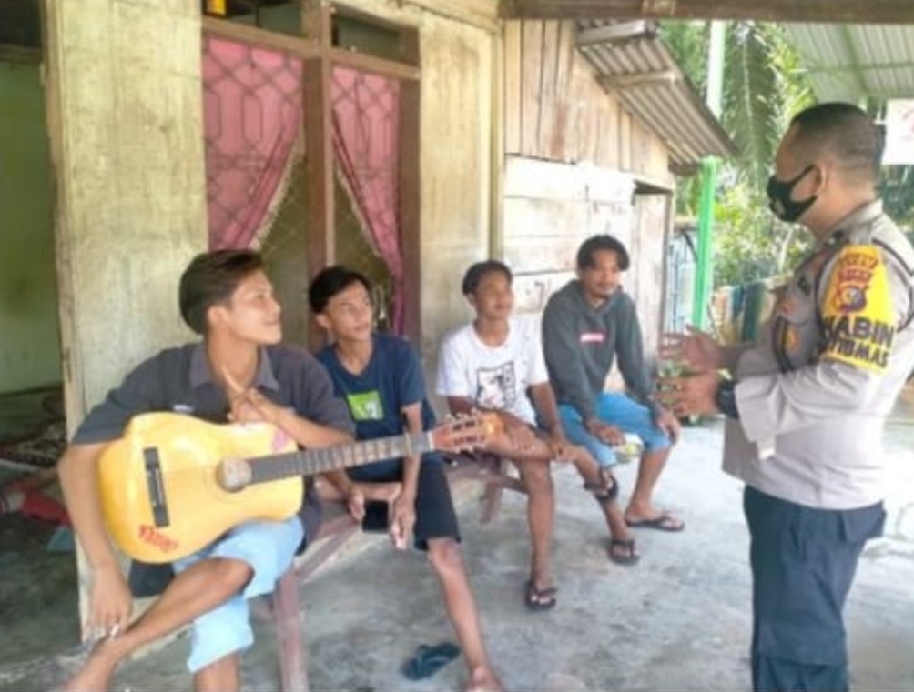 SIAK – Sebagai upaya pencegahan penyebaran virus Covid-19, Bhabinkamtibmas Kampung Gabung Makmur, Polsek Kerinci Kanan Aipda Hendri memberikan teguran lisan dan meninggalkan pesan kepada pemuda yang tidak patuhi Protokol Kesehatan dan sekilugus sosalisasi tentang Protokol Kesehatan di tengah pandemi Covid-19, Minggu (15/11/2020) .