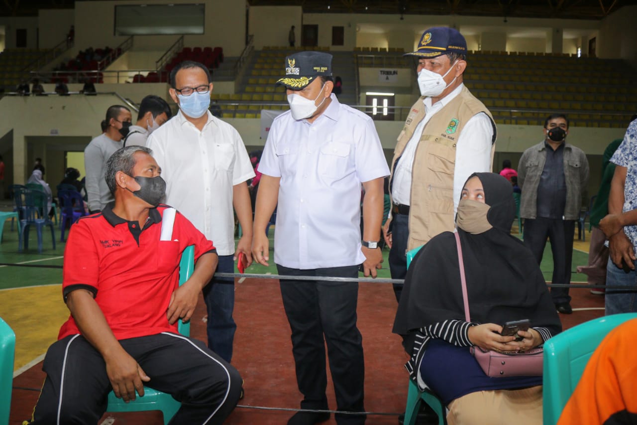 SIAK- Wakil Bupati Siak Husni Merza bersama Kapolres Siak AKBP Gunar Rahadiyanto meninjau pelaksanaan vaksinasi massal di Gedung Olahraga Kecamatan Tualang, Sabtu 26 Juni 2021.