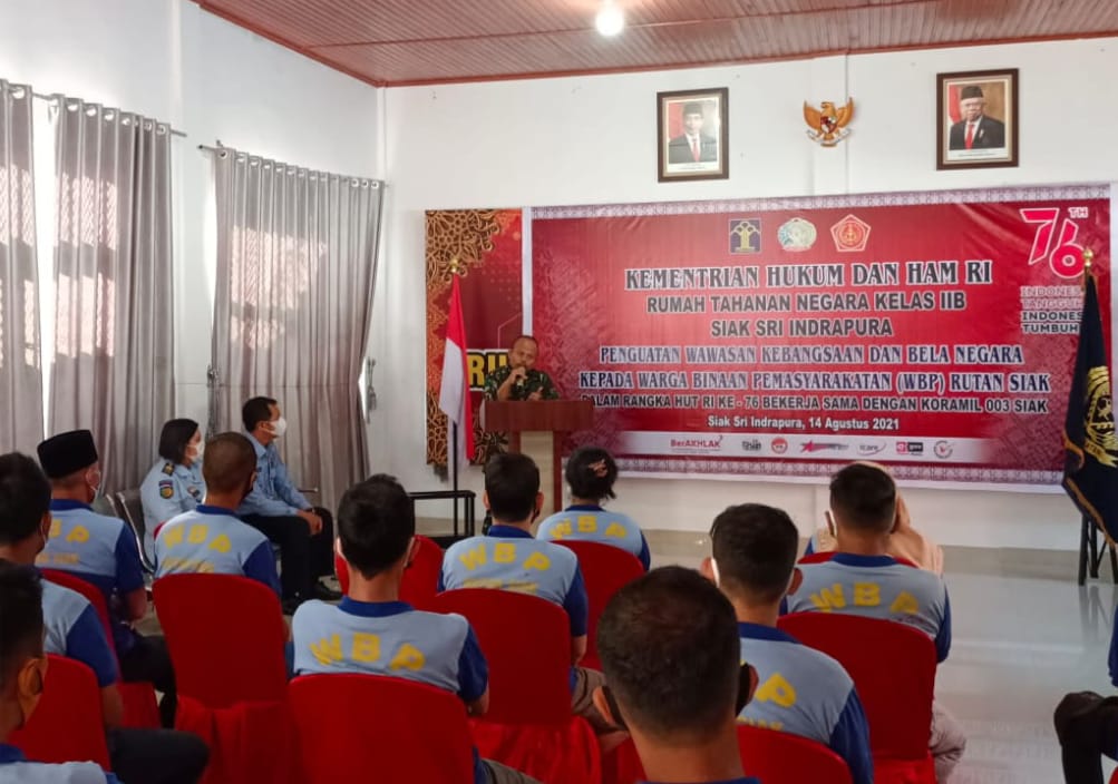 Siak Sri Indrapura – Komandan Koramil 03/Siak Kodim 0303/Bengkalis melalui Wadanramil Kapten Inf Junaidi melaksanakan pemberian wawasan kebangsaan dan pelatihan Bela Negara kepada warga binaan pemasyarakatan Kelas II B Siak Sri Indrapura di Kelurahan Kampung Dalam Kecamatan Siak Kabupaten Siak, Minggu (15/08/2021).