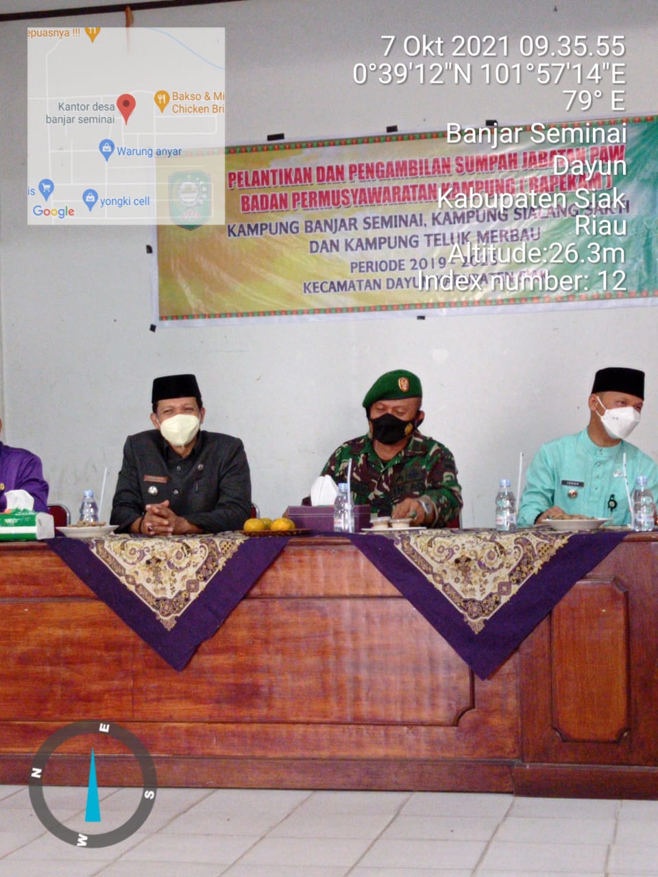 Dayun – Danramil 03/Siak diwakili Wadanramil Kapten Inf Junaidi dan Forkompinca menghadiri Pelantikan dan pengambilan sumpah jabatan Bapekam Kampung Banjar Seminai, Sialang Sakti dan Kampung Teluk Merbau Kecamatan Dayun Kabupaten Siak,Kamis (07/10/2021).